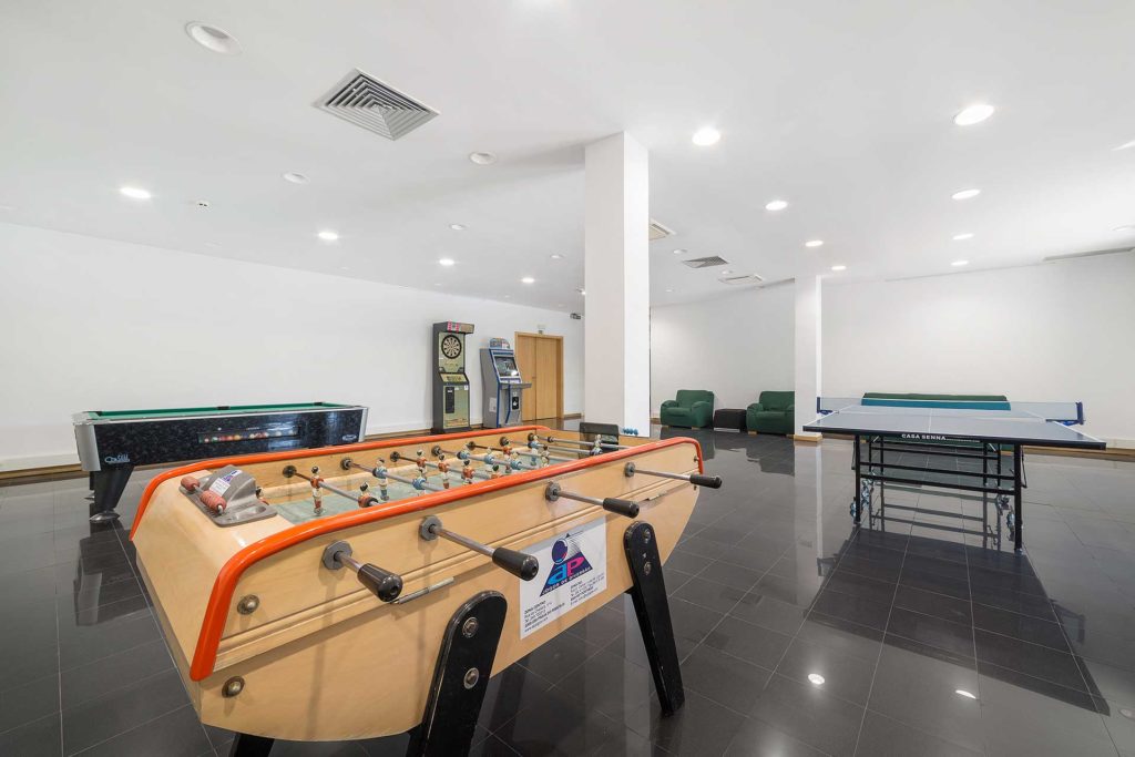 A sala de convívio conta com diversas máquinas de entretenimento e no exterior do edifício encontra um parque infantil, um campo de jogos multiusos e uma piscina para se refrescar nos dias mais quentes do ano.
